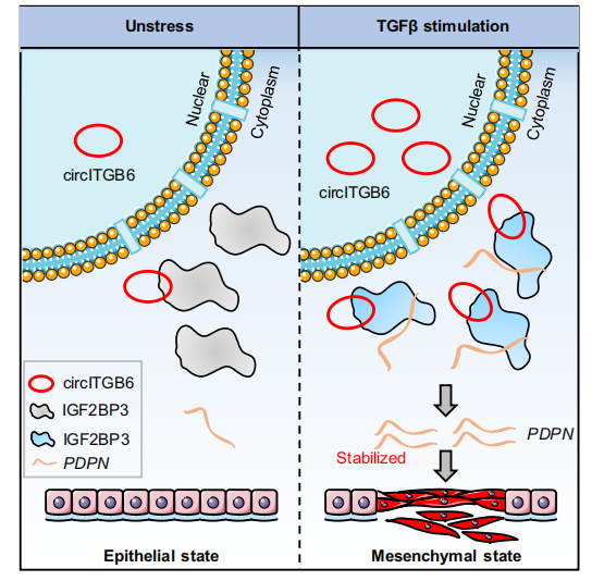 环状RNA在肿瘤转移中的作用已有很多报道。本研究也详细地解析了circITGB6发挥肿瘤细胞转移功能的机制。circITGB6可被TGFβ诱导表达,促进了结直肠癌和肺癌的EMT过程和肿瘤转移过程。在机制上,circITGB6通过与IGF2BP3的直接互作,激活IGF2BP3并稳定其下游转录本PDPN mRNA的表达,促进肿瘤转移。不过,circITGB6的siRNA对肿瘤转移的抑制效果令人满意。这一重大发现,将为采用靶向circITGB6治疗癌症转移的方案提供有力依据。