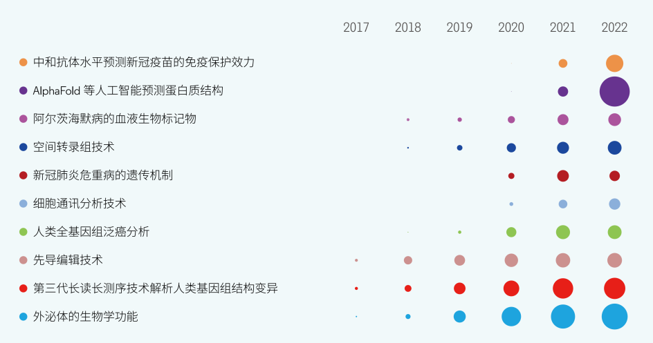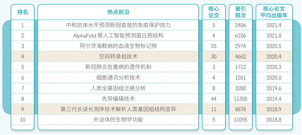 生物科学领域位居前十位的热点前沿包括先导编辑技术、新型测序技术、人工智能预测蛋白质结构、人类全基因组泛癌分析、阿尔茨海默病的血液生物标志物、外泌体的生物学功能和新型冠状病毒(SARS-CoV-2)感染等研究方向。
