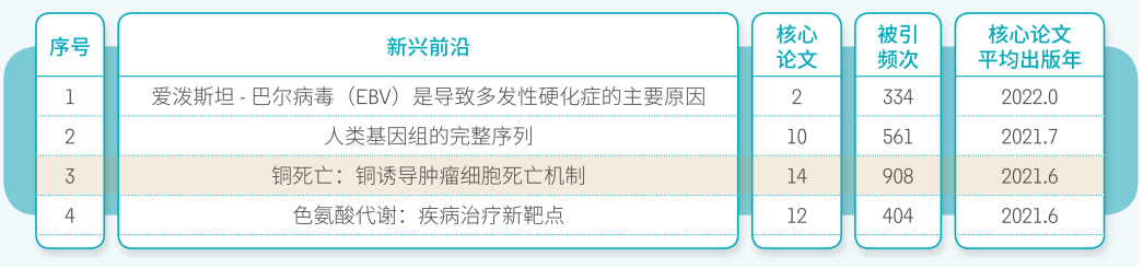 生物科学领域有 4 项研究入选新兴前沿,主要研究主题包括“爱泼斯坦 – 巴尔病毒(EBV)是导致多发性硬化症的主要原因”、“人类基因组的完整序列”、“铜死亡:铜诱导肿瘤细胞死亡机制”和“色氨酸代谢:疾病治疗新靶点”。综合 CPT 指标、前沿发展潜力及科技情报研究人员的判断,最终选取“铜死亡:铜诱导肿瘤细胞死亡机制”前沿重点分析。