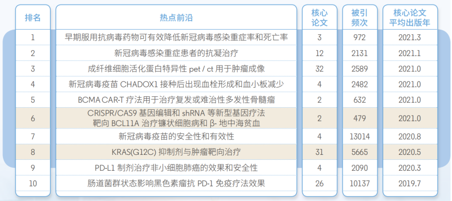 此外,基因治疗经过多年发展和应用,今年首次出现了基因治疗应用于临床的热点前沿,预计未来会涌现出更多的相关热点研究。