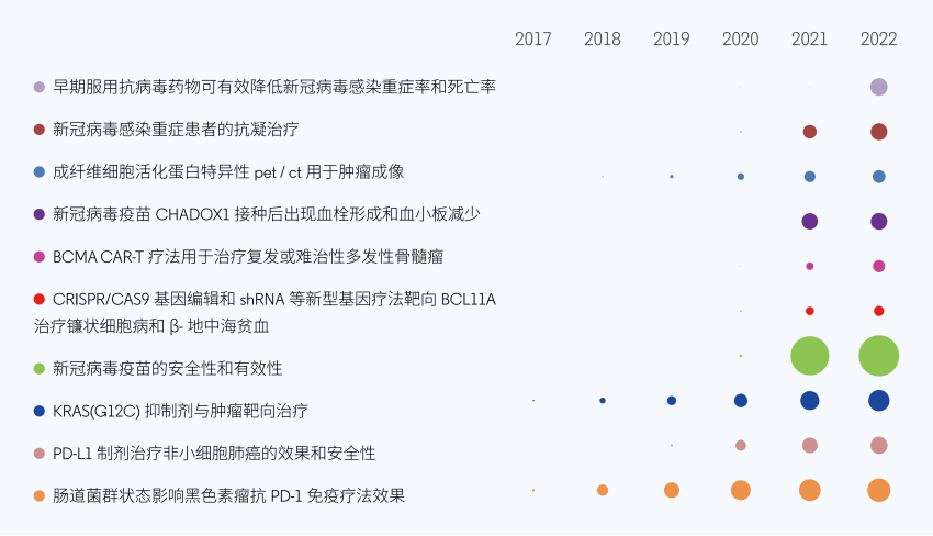 随着新冠疫情进入尾声,临床医学领域针对新冠病毒及其感染的研究热度也较前两年有所降低,且关注点发生变化。前两年以新冠病毒感染的临床表现、并发症、发病机制研究为主,去年开始新冠药物治疗和疫苗评价成为新的热点前沿,今年4个新冠热点前沿均聚焦于药物治疗和疫苗评价,是去年热点的延续。