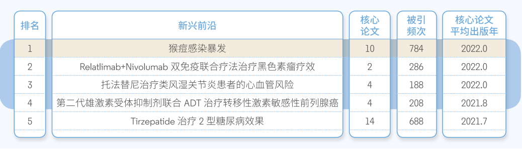 临床医学领域2023年入选的5个新兴前沿主要涉及猴痘流行病学研究、黑色素瘤免疫治疗、托法替尼治疗的心血管风险、前列腺癌联合治疗、2型糖尿病治疗5个方面。综合CPT指标、前沿发展潜力及科技情报研究人员的判断,最终选取“猴痘感染暴发”前沿作为重点分析对象。
