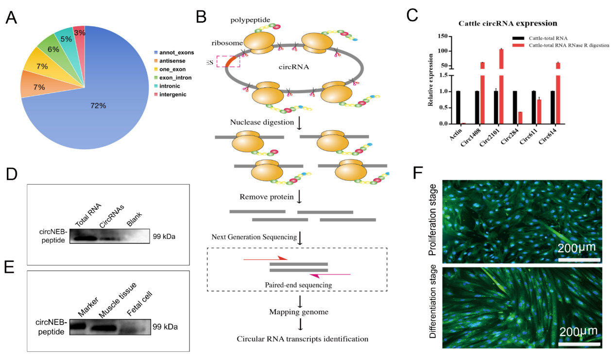 几千年来,牛骨骼肌与协助农耕的役力一直是农业生态系统的重要组成部分。然而,对牛肌肉功能基因组学(包括蛋白质编码基因、非编码RNA等)的了解相对较少。环状RNA(Circular RNAs, circRNAs)作为一类新的非编码RNA,可以被有效地翻译成可检测的多肽或蛋白,这让我们意识到环状RNA在牛肌肉生理功能中的重要性。