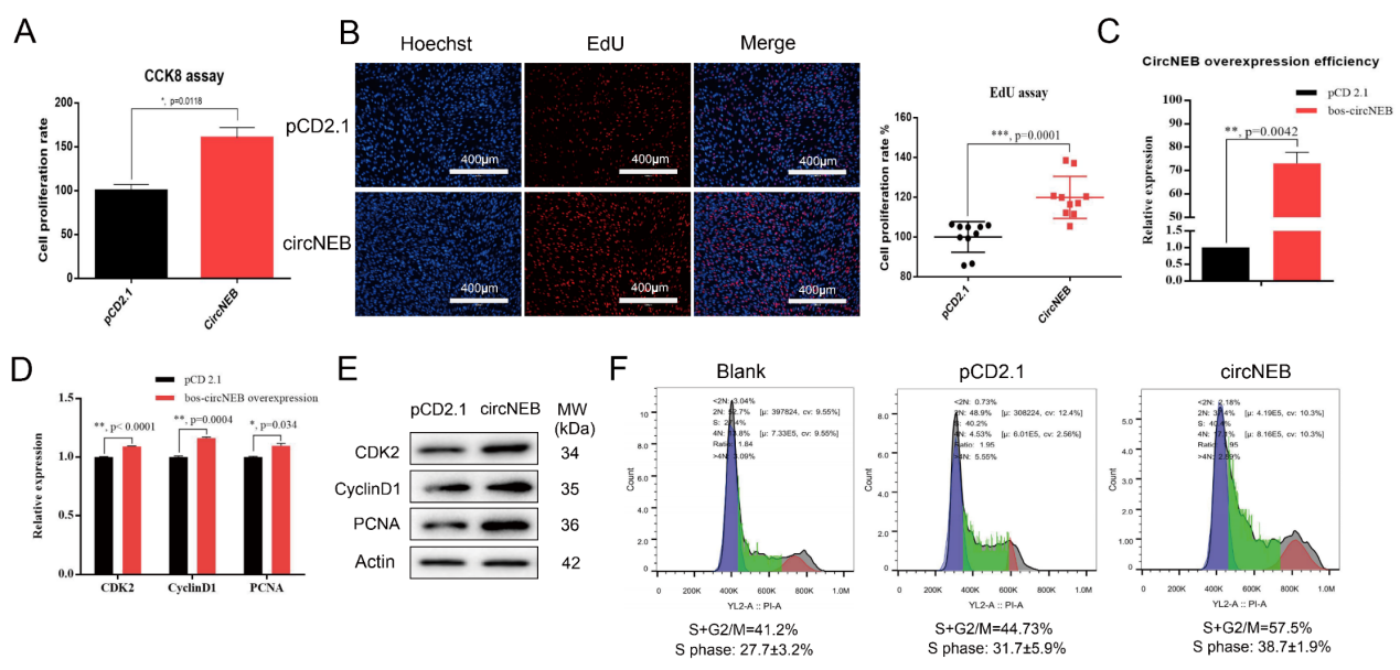 为了明确circNEB是否会影响成肌细胞的增殖,我们对牛成肌细胞过表达circNEB。CCK8和EdU实验结果显示,circNEB显著促进了成肌细胞的增殖。随后,我们检测了以下增殖关键基因CDK2、PCNA和CyclinD1的表达,其mRNA和蛋白表达量均显著上调。我们观察到circNEB组的S期和G2/M期细胞比例明显高于对照组。这些结果表明circNEB促进牛成肌细胞的增殖。