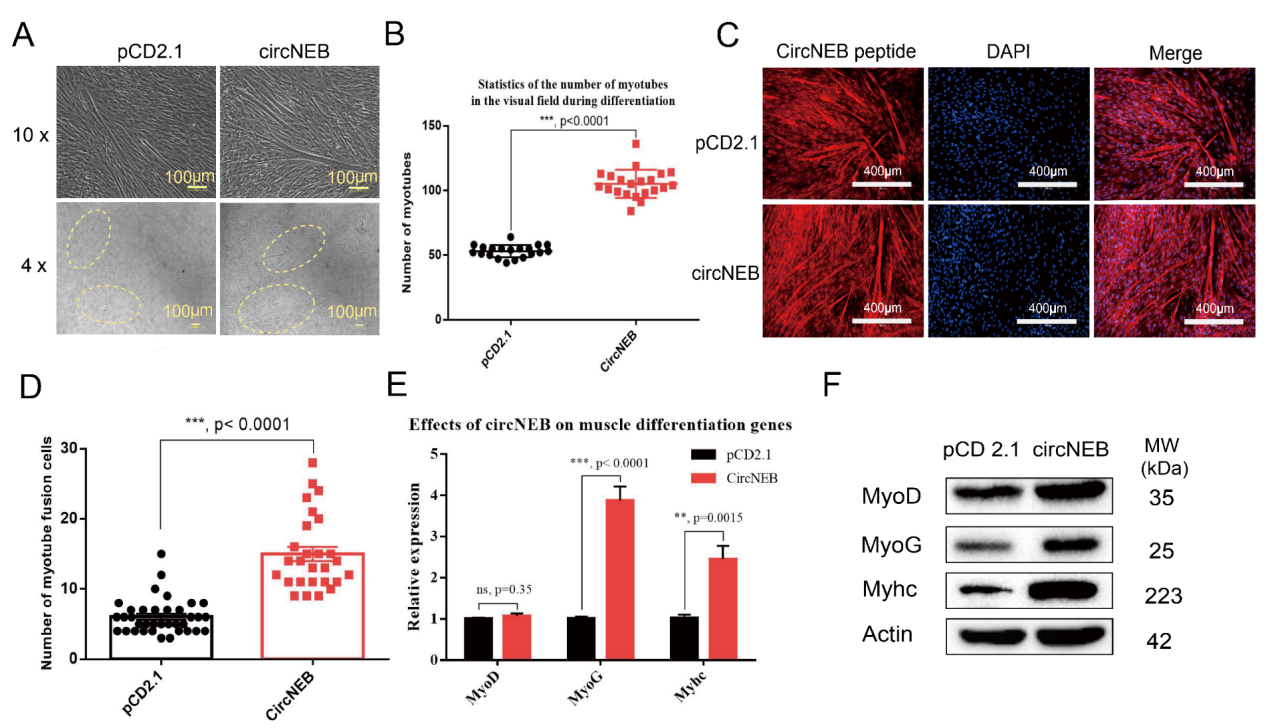 为了探究circNEB是否影响成肌细胞向肌管分化,我们在过表达circNEB后诱导成肌细胞分化。第五天,在分化培养基培养时的肌管circNEB组明显高于对照组。circNEB组的肌管融合细胞的数量明显高于对照组,表明circNEB促进成肌细胞融合。此外,我们检测了肌肉细胞分化关键基因的表达水平。qPCR和western blotting结果显示,circNEB促进MyoD、MyoG和Myhc的表达,这些成肌分化相关基因的表达上调也支持了circNEB促进成肌细胞分化的现象。