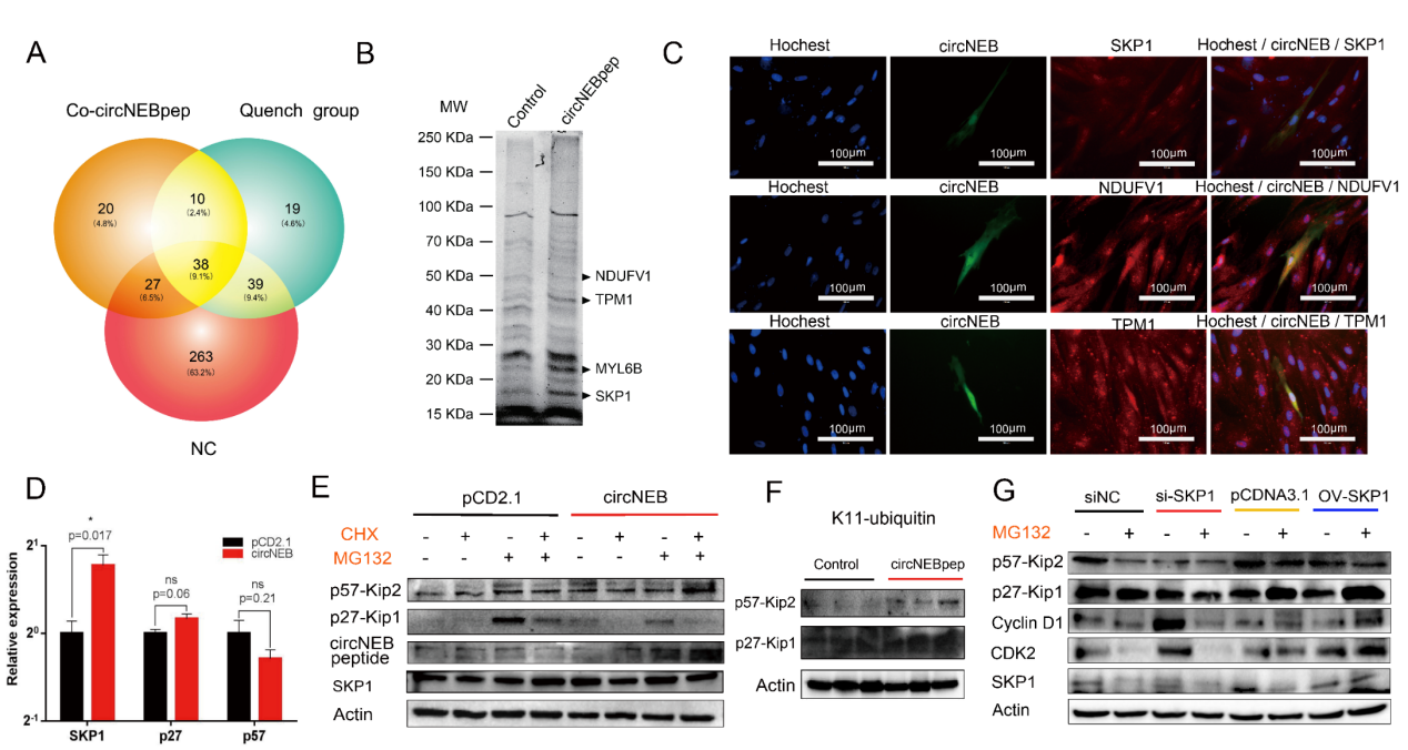 为了揭示circNEB编码的蛋白如何发挥调控功能,我们通过Co-IP试验联合质谱鉴定了互作蛋白。结果显示,circNEB-peptide可能与SKP1、NDUFV、TPM1和MYL6B相互结合。为了验证这种互作关系,我们进一步通过融合带有EGFP蛋白表达的载体,验证了互作蛋白与circNEB-peptide的亚细胞定位是相同的。接着分析这些互作蛋白潜在调控作用,我们查阅了相关文献并提出了如下假设:SKP1蛋白是调控成肌细胞增殖过程中关键的泛素化酶组分,其构成的SCF泛素化酶可能介导了KIP复合物的降解,进而解除细胞增殖的抑制作用。为了验证这一假说机制,我们首先通过反向Co-IP试验再次证明了SKP1蛋白能结合circNEB-peptide。