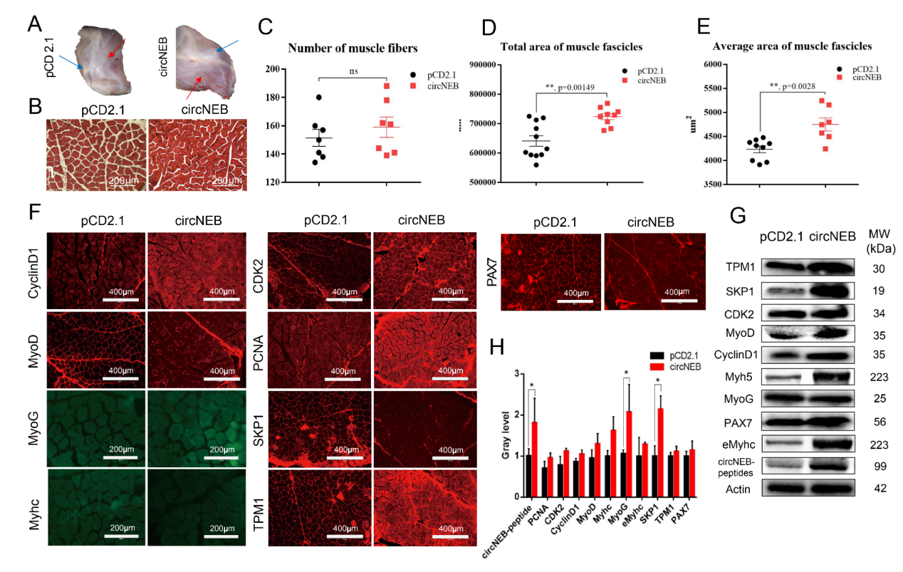 为了探讨circNEB是否可以改善衰老引起的肌肉萎缩,我们在衰老家兔的股二头肌和股四头肌中过表达circNEB。过表达circNEB后,组织形态学分析显示肌纤维间隙减小。因此,我们统计分析了视野内肌纤维的数量和横截面积。