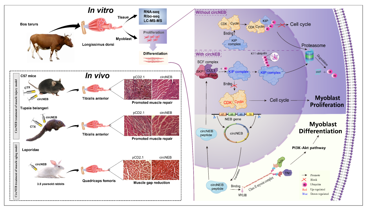 在这里,我们整合了来自牛骨骼肌的RNA-seq、Ribo-seq和蛋白质组学数据,筛选到5个具有编码潜能的circRNA。我们进一步鉴定并功能表征了907个氨基酸的肌肉特异性蛋白,circNEB编码蛋白。该蛋白定位于细胞核和细胞质,并分别通过泛素化和成肌细胞融合与调节成肌细胞生理活动的关键因子SKP1和TPM1直接相互作用。circNEB蛋白在体外可促进成肌细胞的增殖和分化,在体内可诱导肌肉再生。这些发现表明circNEB是骨骼肌再生的重要调节因子,并强调了目前标记为非编码的RNA衍生的更多编码多肽或蛋白存在的可能性。