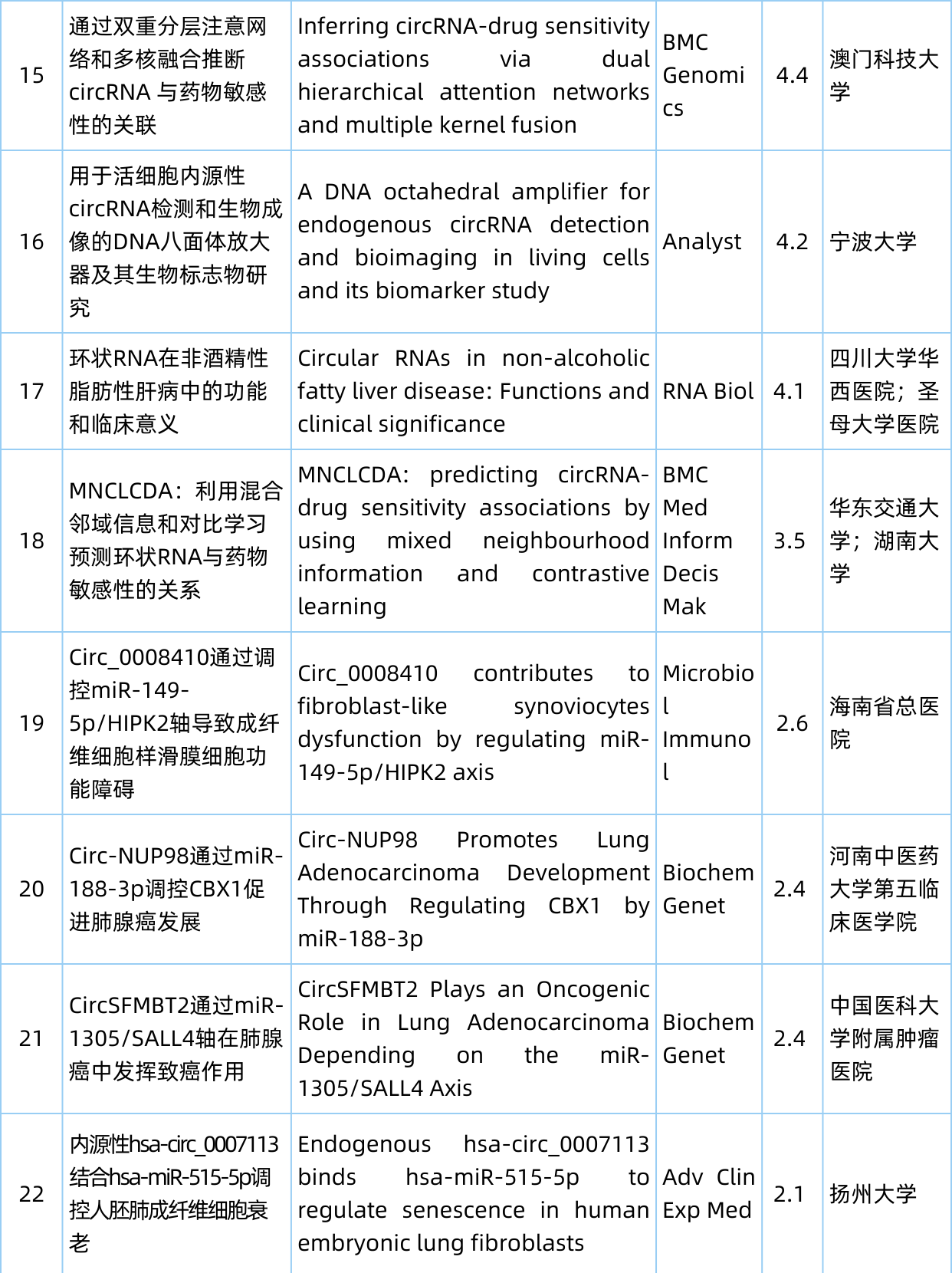 欢迎各位来到“circRNA研究汇总”栏目,本期从pubmed中检索收集最新发布的circRNA文献共计22篇,现在让我们一起看看circRNA研究最近有哪些新进展。 检索式:(circRNA[Title/Abstract]) OR circular RNA[Title/Abstract] 研究汇总列表 分类: circRNA与疾病, 前沿动态, 最新重要进展, 每周进展汇总, 研究思路与技术, 研究热点跟踪admin十二月 25, 2023评论