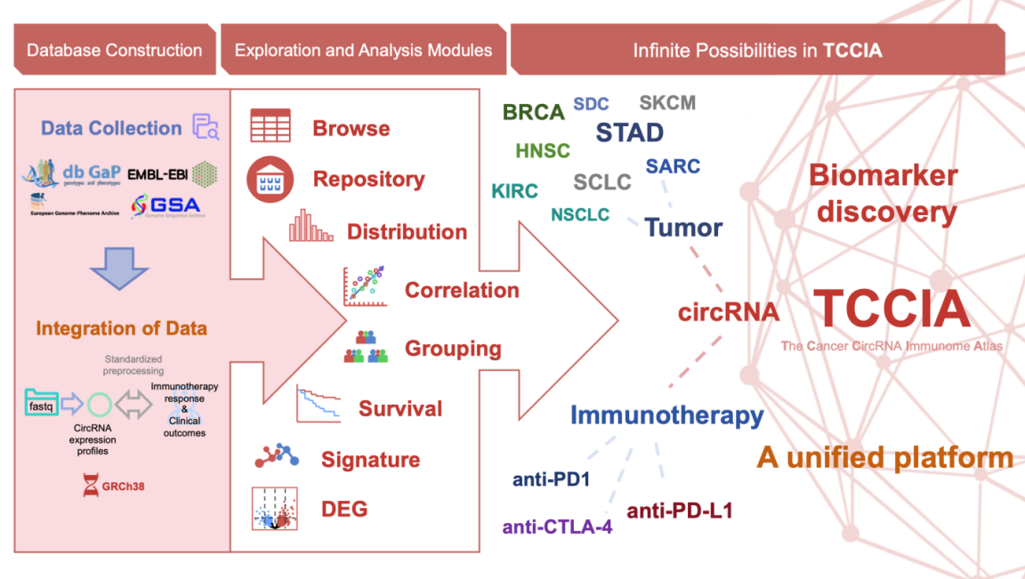 研究团队搜集并整合了25个肿瘤免疫治疗临床队列的超过4000例肿瘤样本,然后进行统一的RNA-seq测序原始数据和临床表型数据预处理、circRNA检测、免疫细胞组分解析、肿瘤分子特征评分等,以此构建出首个综合性的肿瘤免疫治疗circRNA数据库TCCIA(The Cancer CircRNA Immunome Atlas),为探索circRNA与肿瘤免疫治疗疗效和肿瘤/免疫分子特征的关联和互作、挖掘和验证circRNA分子标志物提供了重要的数据资源和分析平台。