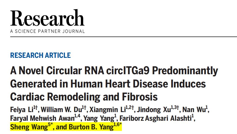 2023年2月,加拿大多伦多大学杨柏华教授团队在Research(IF=11.0)发表文章“A Novel Circular RNA circITGa9 Predominantly Generated in Human Heart Disease Induces Cardiac Remodeling and Fibrosis”,在本文中,作者发现了32,034个以前未发现的具有不同心脏表达模式的circRNA。值得注意的是,由整合素-α9衍生的circRNA circITGa9在心肌肥厚患者中表现出明显的上调。且circITGa9可通过结合原肌球蛋白3(TPM3)调节诱导肌动蛋白聚合,从而影响心脏组织纤维化。最后,作者开发了靶向circITGa9的阻断寡聚物抑制circITGa9和TPM3相互作用改善心脏功能和减少纤维化,该寡聚物可用于进一步的临床前和转化开发。综上所述,circITGa9水平升高驱动心脏重塑和纤维化。通过确定circITGa9作为治疗靶点,作者为减轻心脏重塑和纤维化的创新干预提供新的思路。