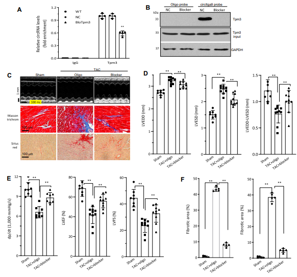 为了探索开发治疗方法的潜力,作者合成了阻断寡聚物(Blocking oligos)来阻断circITGa9与TPM3的结合。qPCR分析显示,阻断circITGa9结合位点可显著减少circITGa9与TPM3的结合。M型图显示,阻断circITGa9与TPM3相互作用后,TAC心脏左室收缩功能增强。在注射阻断寡聚物的TAC小鼠心功能测量中,作者观察到LVEDD和LVESD显著降低,LVESD-LVEDD显著增加。作者还检测到左心室压显著增加,LVFS和LVEF显著增加,表明TAC小鼠心功能改善。