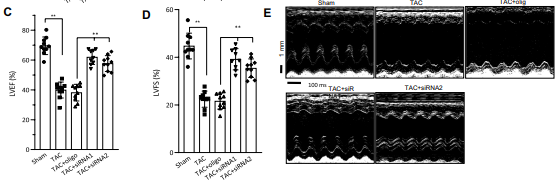然后作者设计了2个针对circITGa9连接序列的siRNA。将siRNA与金纳米颗粒结合,并将其送入TAC小鼠体内后发现,虽然TAC后8周心脏中circITGa9水平显著升高,但siRNA仍然降低了circITGa9水平。在沉默circITGa9的TAC小鼠心功能测量中,作者检测到LVESD和LVEDD显著降低,但LVESD-LVEDD显示出显著增加。作者还发现左室压、LVEF、LVEF和LVFS显著升高。M型超声显示沉默circITGa9可预防TA引起的左室收缩减少。
