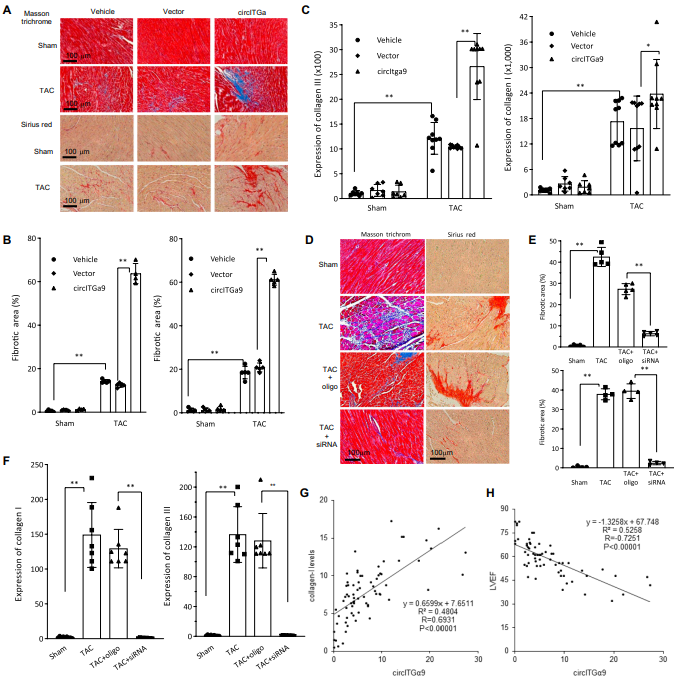 由于心脏纤维化是与心脏肥厚重塑密切相关的主要结果之一,作者通过对心脏组织进行马松三色和天狼星红染色观察胶原沉积,从而研究circITGa9在心脏纤维化中的作用。定量分析显示,与对照组相比,TAC小鼠心脏中马松三色和天狼星红染色明显增加,而通过注射递送过表达circITGa9进一步增加了TAC小鼠的胶原沉积。qPCR结果显示,TAC小鼠的胶原I和胶原III表达显著上调,表明circITGa9过表达进一步增加心脏胶原水平,导致纤维化增强。在沉默circITGa9后,心脏组织中马松三色和天狼星红水平明显降低,胶原沉积水平降低。此外,qPCR结果显示这些心脏组织中胶原I和胶原III明显减少。在患者标本中,胶原I水平与circITGa9表达呈正相关,而circITGa9表达与心功能呈负相关。