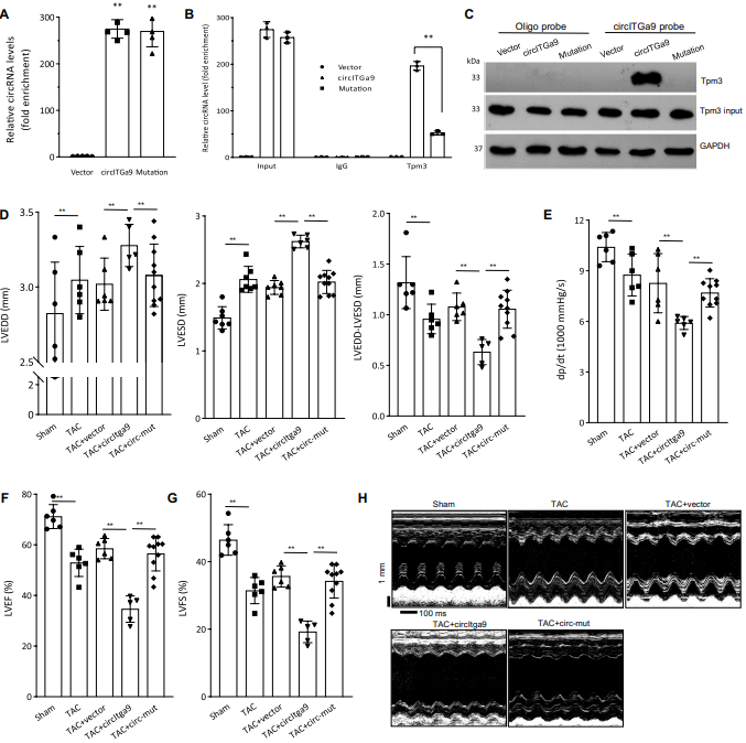 为了进一步证实circITGa9与TPM3的结合活性,作者对结合位点进行定点突变,且结合位点的突变不影响突变体circITGa9的环状化。在进行免疫共沉淀实验后发现,结合位点突变抑制了TPM3抗体对circITGa9的富集。相对的,当突变体转染MCF细胞时,circITGa9探针也不能再调取到TPM3。随后,作者对注射了突变载体的TAC小鼠进行了心功能检测,检测到LVESD和LVEDD显著降低,但LVESD-LVEDD显示显著增加。作者还发现左室压、LVEF(图7F)、LVFS显著升高。M型超声图显示,相对于circITGa9组,circITGa9对TAC小鼠心脏功能的影响减弱。综上所述,circITGa9通过与原肌球蛋白3结合调节肌动蛋白聚合,从而影响心脏纤维化。