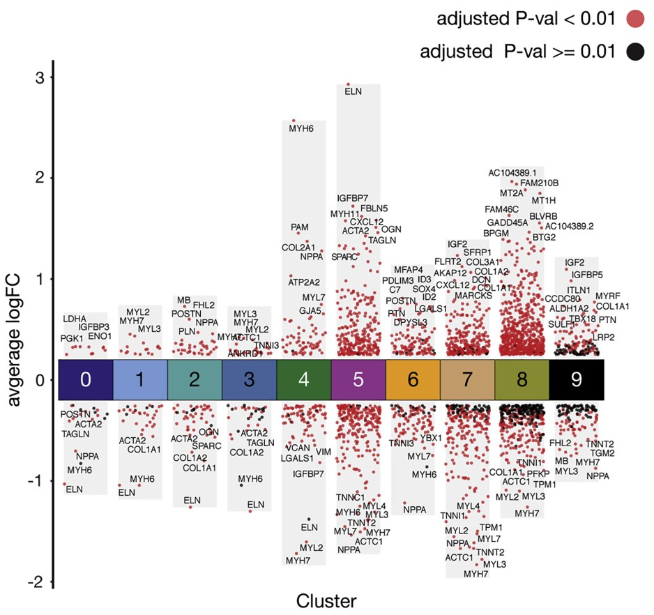 展示了不同颜色的Cluster,每个Cluster代表一种分组,组内红色的点代表adjusted P-value < 0.01的基因,黑色的点则表示adjusted P-value >= 0.01的基因。