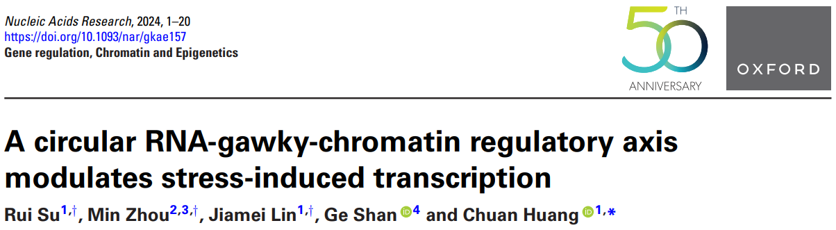 近日,重庆大学生命科学学院黄川团队在Nucleic Acids Research(IF=14.9)上发表题为“A circular RNA-gawky-chromatin regulatory axis modulates stress-induced transcription”的研究论文,揭示了ChRBP分子功能被circRNA调控的全新机制,以及circRNA作为trans-acting因子调控多种应激胁迫基因转录的新功能。
