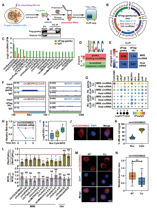 在作者团队之前的研究中,ChRBP gawky是胁迫诱导转录过程中的特异性调控因子。为了阐释gawky调控与被调控的完整通路,在本研究中,作者通过CLIP-Seq及分子生物学实验,鉴定出一类铜胁迫过程中与ChRBP gawky特异性结合且富含金属响应元件的circRNA(metal-responsive element-containing circRNA, MRE circRNA)。circRNA-Seq及核质分离实验显示MRE circRNA均存在于细胞核与细胞质中,且铜处理条件下MRE circRNA而非亲本mRNA的核质比率明显下降,表明其在应激条件下核输出模式的特异性。