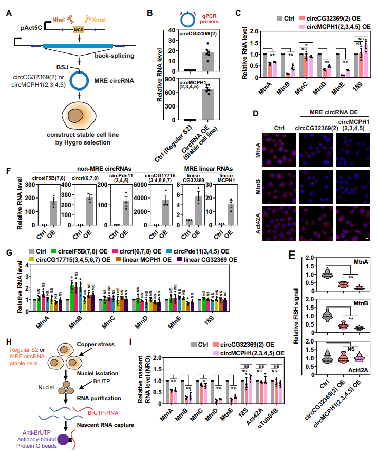 为了探究MRE circRNA调控应激响应基因的功能,作者构建了两个代表性MRE circRNA(circCG32369(2)和circMCPH1(2,3,4,5))过表达载体。发现铜胁迫状态下,MRE circRNA过表达细胞中MT基因(一类已知的应激响应基因)的mRNA水平显著下降。相反,不含MRE基序的对照circRNA或具有相同MRE circRNA序列的线性形式的RNA过表达却不影响MT基因的丰度。Nuclear run-on实验也证实了MRE circRNA的过表达会显著抑制MT 基因的新生转录物的丰度。以上数据证明,MRE circRNA作为有效的转录抑制因子响应铜胁迫。