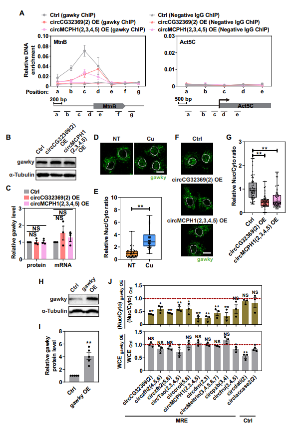 同时,gawky ChIP实验表明,相较于普通S2细胞,MRE circRNA过表达细胞中gawky结合MtnB基因启动子的能力显著降低。在铜胁迫下,gawky需要进入细胞核发挥应激转录调控功能。此时猜想,MRE circRNA是否调节gawky蛋白的核质穿梭能力。事实上,免疫荧光实验显示MRE circRNA的过表达导致大部分gawky在细胞质中积累。与此同时,gawky蛋白的增加也使得MRE circRNA的核质比率降低。综上所述,MRE circRNA通过调节gawky的分子功能(即从应激响应基因中释放gawky并增强其细胞质积累)特异性地调节应激诱导的转录。