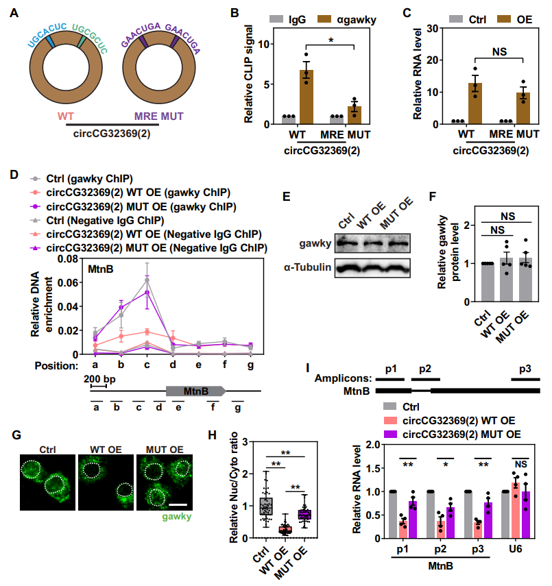 由于此类circRNA中富含MRE,作者猜想MRE可能有助于其在应激诱导转录中发挥抑制作用。为了验证此猜想,该团队构建了MRE circRNA的MRE突变载体。一系列实验表明,gawky结合MRE突变的circRNA的能力显著降低,且gawky与MtnB基因启动子的结合能力不受MRE突变circRNA过表达的影响。同时,MRE突变的circCG32369(2)诱导应激条件下gawky的细胞质积累能力大大受损。因此,MRE缺失的circCG32369(2)对铜诱导的MtnB转录的抑制作用也减弱。circMCPH1(2,3,4,5)的MRE突变体产生了类似的表型。综上实验结果表明,MRE对于circRNA在应激条件下精确调控gawky介导的转录是必不可少的。