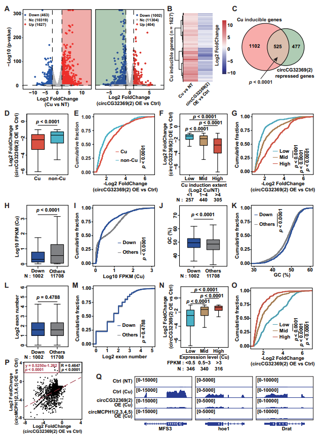 接下来,为了探究MRE circRNA对于应激状态下应激响应基因的转录抑制是否具有广谱性。后续的RNA-Seq分析显示,circCG32369(2)的过表达对1627个硫酸铜处理后表达水平显著升高的基因具有全局的转录抑制作用,且铜诱导基因的表达水平比非诱导基因的表达水平下降的程度要大得多。circMCPH1(2,3,4,5)过表达导致相同的表型,两类MRE circRNA过表达的转录抑制作用也表现出非常显著的相关性。以上研究结果有力地支持了MRE circRNA在抑制应激诱导转录中的广泛作用,并清楚地揭示了它们对应激诱导基因的选择性作用。