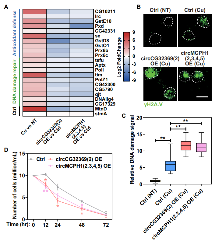 大量研究证明铜诱导细胞毒性的一种重要机制是铜离子的氧化还原产生羟基自由基,导致细胞氧化损伤和DNA链断裂。作者从RNA-seq数据中发现一系列抗氧化防御和DNA损伤修复相关基因在细胞对铜胁迫的防御中显著上调,在两种MRE circRNA稳定细胞系中却被显著抑制。这意味着MRE circRNA可能对细胞抵御不利环境具有负面作用。事实上,MRE circRNA的过表达显著增加了核内的γH2A.V信号,加重了铜诱导的DNA损伤,同时显著降低了细胞的存活能力。以上结果证实了MRE circRNA在铜胁迫下促进受损细胞清除的生理相关性。