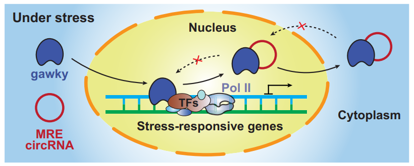 RNA结合蛋白(RNA binding protein,RBP)是一类具有重要分子功能的转录后调节因子,在分子和生理层面参与生物的生命进程。然而,与RBP的经典功能不同,一类直接作用于染色质的RBP(chromatin-interacting RBP,ChRBP)近期被报道在基因的转录过程中发挥重要调控作用。例如,ChRBP Hlc和gawky可以在活性染色质上协助通用转录机器区分本底转录和应激诱导转录。然而,ChRBP的上游调控因子及ChRBP被调控的分子机制尚未阐明。研究表明,环状RNA (circRNA)是一类单链且共价闭合的核酸分子,通过多种分子机制参与基因表达调控,并与多种人类疾病的发生发展密切相关。由于其半衰期长、不易降解的特性,circRNA可能是ChRBP在染色质上发挥正确分子功能的潜在调控因子。