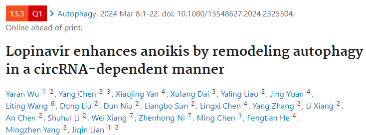 2024年3月8日,《Autophagy》(IF=13.3)发表了陆军军医大学连继勤教授团队的研究论文,题为“Lopinavir enhances anoikis by remodeling autophagy in a circRNA-dependent manner”。该研究证实了FDA批准药物洛匹那韦(Lopinavir)能够以circRNA依赖方式促进胃癌细胞失巢凋亡进而抑制转移,率先提出了具有潜在临床应用价值的靶向circRNA的治疗方法。具体而言,circSPECC1通过与ATG4B结合,加速ATG4B相分离并促进ATG4B泛素化降解;而ELAVL1以m6A依赖方式结合并下调circSPECC1,解除了circSPECC1对ATG4B的抑制作用,使胃癌细胞获得抗失巢凋亡能力,进而造成远处转移。FDA批准药物洛匹那韦通过抑制ELAVL1与circSPECC1结合,上调circSPECC1表达,从而抑制胃癌转移。洛匹那韦有望成为转移性胃癌的潜在临床干预手段。
