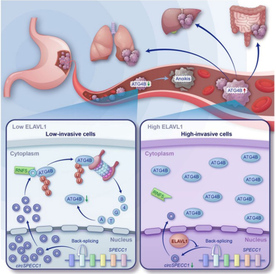 总之,该研究从体外细胞水平,动物体内水平及临床标本水平证实了ELAVL1-circSPECC1-ATG4B通路在胃癌失巢凋亡抵抗以及转移中的作用,并据此提出了新的潜在干预策略,为转移性胃癌的临床预防与治疗提供了新思路。