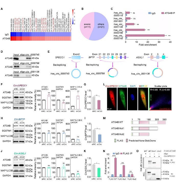 连继勤教授团队通过ATG4B RIP-seq分析,进一步结合RNA pull down及RIP-qPCR验证,发现ATG4B可与circSPECC1、circBPTF以及circASXL1三个circRNA结合(图1A-E)。采用靶向反向剪接位点的siRNA对上述三个circRNA分别进行敲降,结果显示只有circSPECC1可抑制ATG4B表达,同时伴随有自噬水平降低(图1F-L)。ATG4B截短突变结合RIP-qPCR及RNA pull down实验证实,ATG4B与circSPECC1结合依赖其191-305位氨基酸序列(图1M-O)。