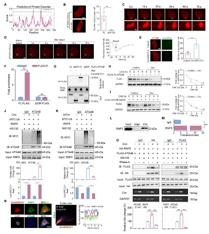 研究表明,RNA与蛋白结合,可促进蛋白发生相分离。相分离在维持细胞内各生化反应有序进行、提高生化反应效率方面发挥重要作用。采用IUPred2A对ATG4B氨基酸序列进行分析,发现存在可能的内部无序区(IDRs)。将该区域进行缺失突变后,ATG4B在细胞内聚集的荧光小点变为弥散分布(图2A,B)。时序图像分析及FRAP实验证实,ATG4B形成的荧光斑点具有高度动态性,具备相分离凝聚体的特征,过表达circSPECC1可促进ATG4B发生相分离(图2C,D)。分别检测circSPECC1对ATG4B野生型及无法发生相分离的IDRs缺失突变体的蛋白稳定性影响,发现circSPECC1可缩短ATG4B蛋白半衰期,而对无法发生相分离的缺失突变体无显著影响(图2E-I)。进一步通过免疫共沉淀实验检测ATG4B泛素化水平变化,证实circSPECC1增强了RNF5介导的ATG4B泛素化降解(图2J-O)。