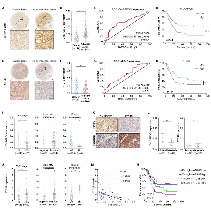 与癌旁组织相比,胃癌组织中circSPECC1水平显著降低,ATG4B表达水平明显升高。且在TNM分期为III/IV期、淋巴结转移阳性及具有远处转移的组织中,circSPECC1表达水平显著下调,而ATG4B表达明显增加(图3A-J),表明上述两个分子与胃癌转移密切相关。胃癌组织中相关性分析发现,circSPECC1与ATG4B呈负相关,且二者联合分析对于患者生存期预测具有重要意义(circSPECC1表达越低、同时ATG4B表达越高的患者生存期越短)(图3K-N)。表明胃癌组织中低表达的circSPECC1是造成ATG4B升高进而发生转移的重要原因。
