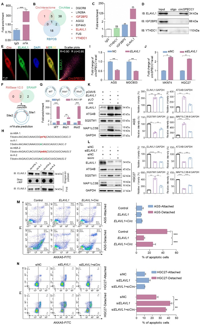 M6A在维持细胞内circRNA水平的动态平衡过程中发挥重要作用。MeRIP-qPCR实验证实,circSPECC1能够发生m6A修饰(图4A)。生信预测结合RIP-qPCR、RNA pull down及荧光共定位分析发现,阅读蛋白ELAVL1与circSPECC1结合(图4B-E)。定点突变实验证实,ELAVL1识别circSPECC1需以m6A依赖方式进行(图4F-H)。此外,Real-time PCR实验发现ELAVL1对circSPECC1发挥负调控作用,功能回复实验证实ELAVL1通过下调circSPECC1促进ATG4B表达,从而抑制胃癌细胞失巢凋亡(图4I-N)。