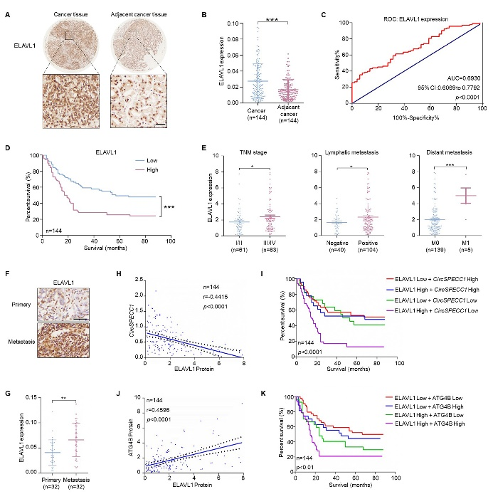 与癌旁组织相比,胃癌组织中ELAVL1水平显著升高。且在TNM分期为III/IV期、淋巴结转移阳性及具有远处转移的组织中,ELAVL1表达明显增加(图5A-G),表明ELAVL1与胃癌转移密切相关。胃癌组织中相关性分析发现,ELAVL1表达水平与circSPECC1呈明显负相关,与ATG4B呈正相关。两两联合分析对于患者生存期预测具有重要意义(ELAVL1表达越高同时circSPECC1表达越低、ELAVL1及ATG4B同时表达较高的患者生存期越短)(图5H-K)。