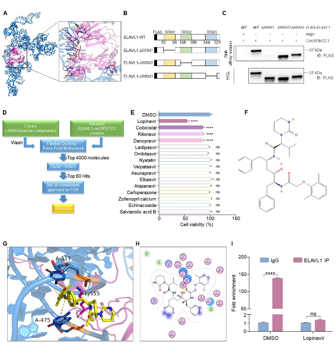通过分子对接结合虚拟筛选,发现确实存在小分子化合物可进入到ELAVL1与circSPECC1的结合区域。通过对接时所需自由能高低进行排序,选取了所需自由能最低的60个化合物(图6A-D)。在这60个化合物中,有20个化合物为FDA批准药物。考虑到临床使用的可行性,排除掉上述20个化合物中的兽用抗生素、手术麻醉剂等具有特殊用途的药物,对剩余15个药物进行筛选,发现洛匹那韦可显著抑制悬浮培养状态下胃癌细胞存活(图6E-H)。RIP-qPCR实验进一步证实洛匹那韦可抑制ELAVL1与circSPECC1结合(图6I)。