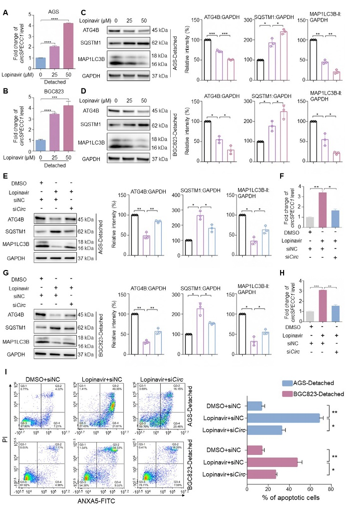7、洛匹那韦通过上调circSPECC1抑制ATG4B,进而促进胃癌细胞失巢凋亡。