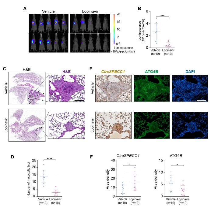 小动物活体成像显示,与对照组相比,洛匹那韦处理组裸鼠肺部的荧光信号显著降低(图8A,B)。HE染色结果表明,洛匹那韦处理组小鼠肺部转移灶数量明显减少,且转移灶中circSPECC1表达水平升高,ATG4B表达水平降低(图8C-F)。