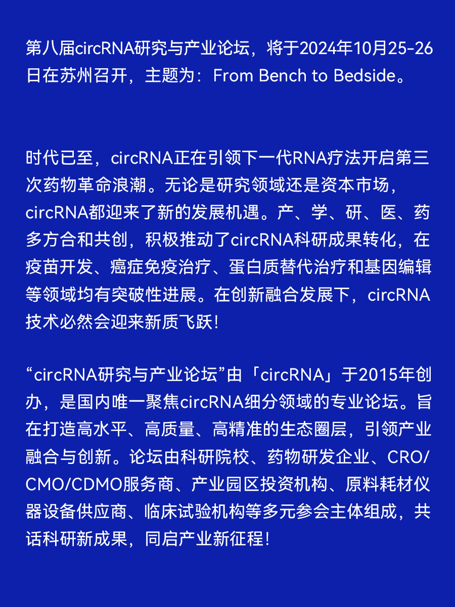 报名通道开启丨第八届circRNA研究与产业论坛,10月25-26日相约苏州!