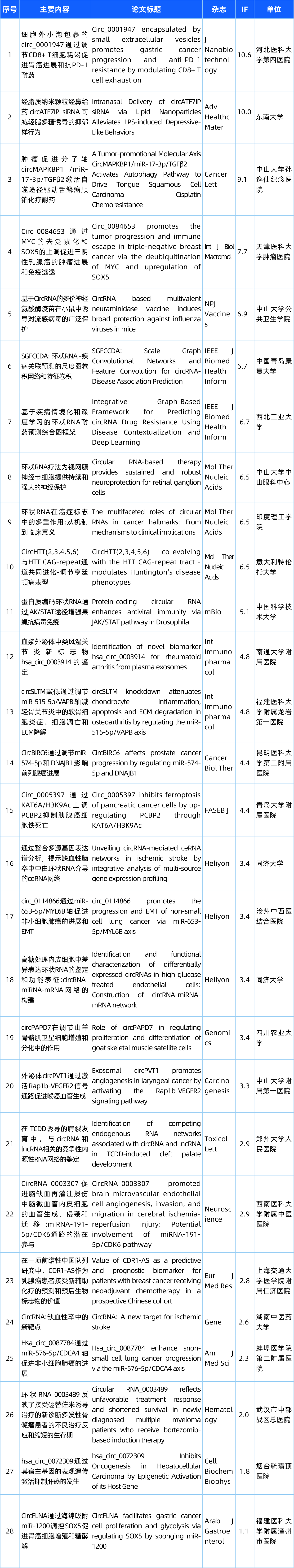 欢迎来到“circRNA研究汇总”栏目,本栏目将为您带来circRNA领域的最新研究成果。本期我们精选了28篇最新文献,涵盖了circRNA的基础研究、功能探究以及与疾病的关联。请您紧跟circRNA研究的步伐,共同洞悉科研前沿的最新动态!