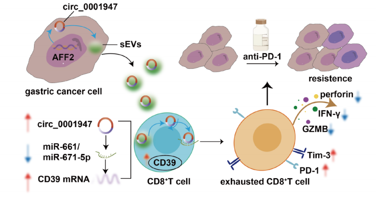 研究发现,GC衍生sEV包装的circ_0001947在GC中明显升高,并与不良临床结果相关。高circ0001947水平增强了胃癌细胞的增殖、迁移和侵袭。机制上,circ0001947海绵吸附miR – 661和miR-671-5p促进CD39的表达,进一步促进CD8+T细胞衰竭和免疫抵抗。相反,阻断circ_0001947表达可减轻CD8+T细胞衰竭,并增加对抗PD- 1治疗的反应。研究表明,靶向sEV传播的circ_0001947可以抑制GC中CD8+T细胞衰竭和免疫抵抗。