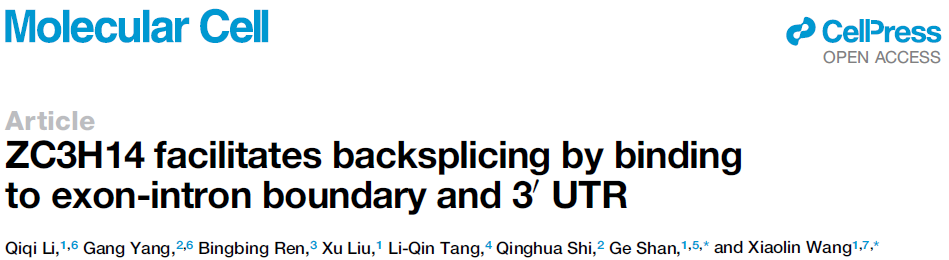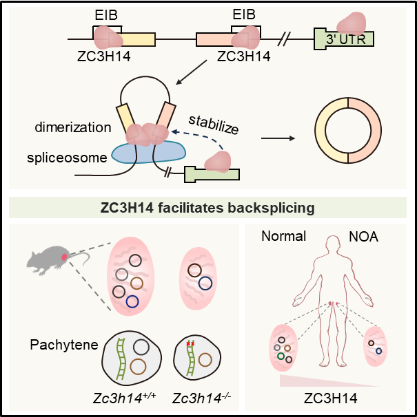 综上所述,该研究鉴定了一个真核生物中保守的反向剪接调控因子ZC3H14,通过结合成环序列外显子-内含子边界和3′ UTR促进环形RNA产生,并揭示了ZC3H14在雄性不育中的生理功能。