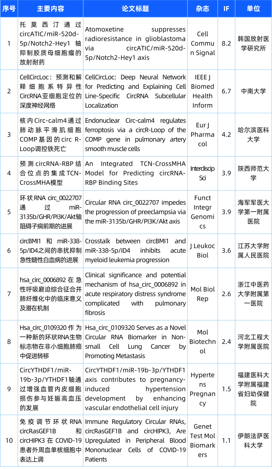 欢迎来到“circRNA研究汇总”栏目,本栏目将为您带来circRNA领域的最新研究成果。本期我们精选了10篇最新文献,涵盖了circRNA的基础研究、功能探究以及与疾病的关联。请您紧跟circRNA研究的步伐,共同洞悉科研前沿的最新动态!