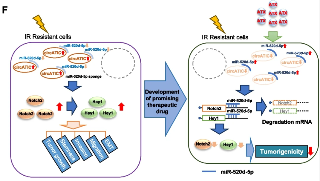 结论:这项研究表明,ATX通过circATIC/miR-520d-5p/Notch2-Hey1信号通路抑制放射抗性。这些结果显示了ATX作为一种能够克服放射抗性的新药的潜力,放射抗性是癌症治疗中的一个主要挑战,并且在该机制中确定的信号因子表明其作为放射抗性诊断和治疗的潜在靶点的可能性。