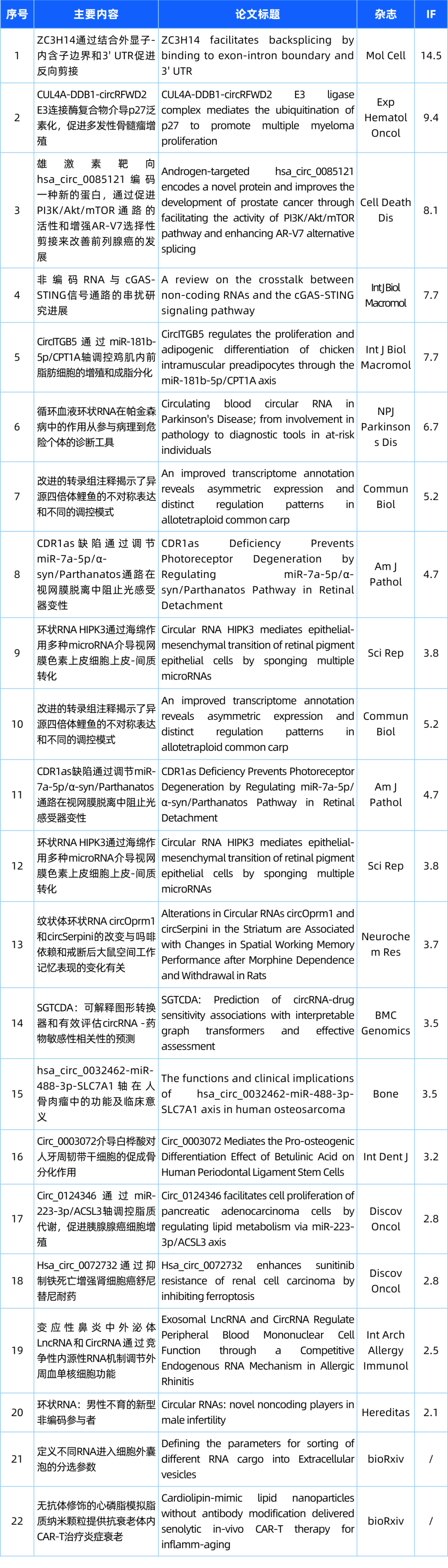 欢迎来到“circRNA研究汇总”栏目,本栏目将为您带来circRNA领域的最新研究成果。本期我们精选了22篇最新文献,涵盖了circRNA的基础研究、功能探究以及与疾病的关联。请您紧跟circRNA研究的步伐,共同洞悉科研前沿的最新动态!