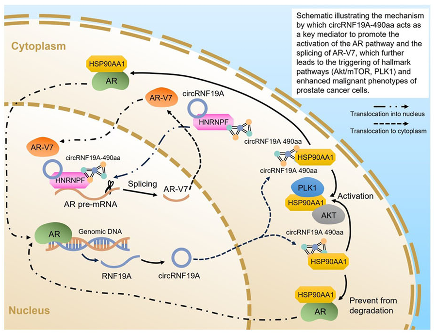 前列腺癌(PCa)是最常见的癌症类型,也是男性死亡的第二大主要原因,在全球范围内发病率显著增加。在本研究中,进行了全转录组分析以鉴定差异表达的环状 RNA(DE-circRNAs)。分析了 DE-circRNAs 的编码能力,发现 hsa_circ_0085121(circRNF19A)不仅在前列腺癌细胞和肿瘤样本中过表达,还编码了一个由 490 个氨基酸组成的多肽,命名为 circRNF19A-490aa。观察到敲低 circRNF19A 可显著抑制前列腺癌细胞的增殖、侵袭、迁移和对多西他赛的耐药性。相反,IRES 的突变显著削弱了 circRNF19A 的促肿瘤功能,表明 circRNF19A-490aa 是调节前列腺癌细胞恶性行为的主要形式。从机制上讲,circRNF19A-490aa 被证明与 HSP90AA1 相互作用,从而增强 AR 活性并促进 Akt/mTOR 和 PLK1 通路的激活。此外,观察到 circRNF19A-490aa 与 HNRNPF 相互作用,促进 HNRNPF 募集到 AR-V7 的剪接位点并增强其可变剪接。最后,观察到雄激素受体(AR)与 RNF19A 基因的启动子区域结合,随后调节 circRNF19A 和 circRNF19A-490aa 的表达。这些数据表明,circRNF19A 通过编码一种新的蛋白质 circRNF19A-490aa 在 AR 激活和 AR-V7 生成中起关键作用,靶向 circRNF19A 可能是阻止去势抵抗性前列腺癌(CRPC)进展的有效策略。
