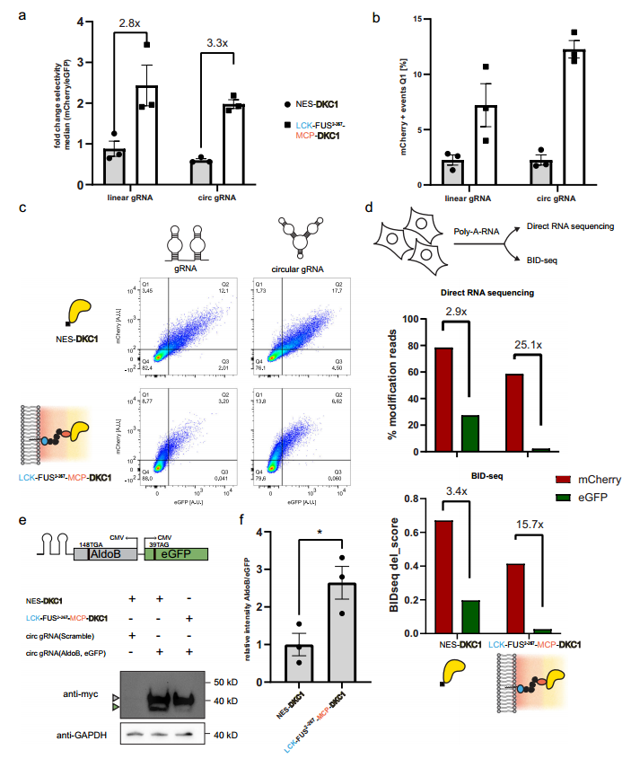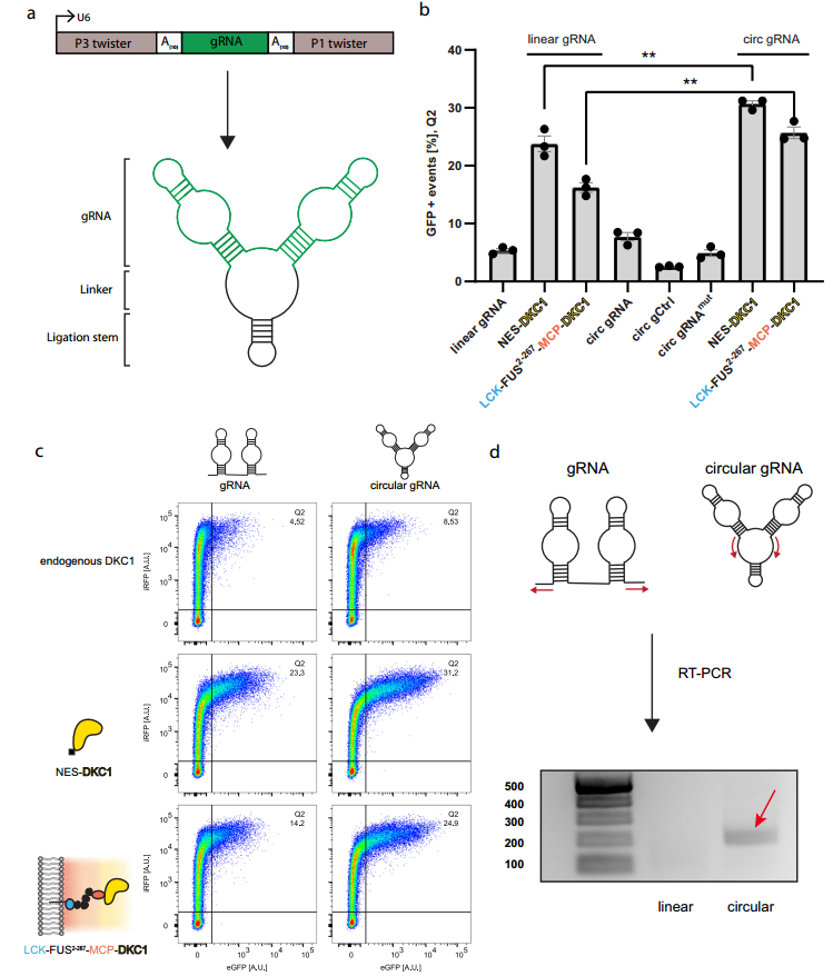 在设计细胞器中,环状gRNA显著增加了GFP阳性细胞的数量(增加了10%)(图3b,c)。这种效果可能由于环状gRNA对外切酶有更大的抗性,积累的水平显著高于线性对应物;也可能由于环状RNA优先从细胞核中输出,而DKC1结构位于细胞质中,这使得环状gRNA的修饰效率更高。