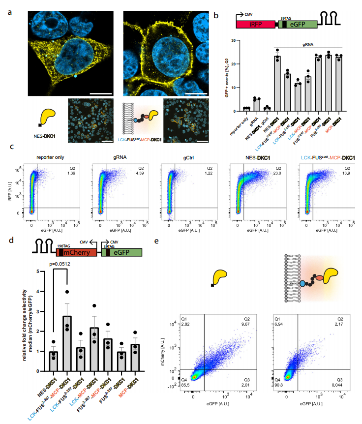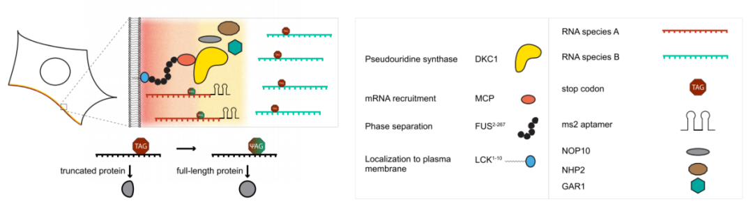 研究在正交翻译膜样细胞器的设计基础上设计细胞器,用啮齿动物LCK酪氨酸激酶(LCK)的n端结构域作为质膜(PM)锚点(图1),蛋白质FUS衍生的内在无序区域(IDR)和主要衣壳蛋白(MCP)作为募集结构域。利用dyskerin在N或C端缺少NLS/NoLS信号的截断形式(aa 22-424,DKC1),并在N端增加了一个核输出信号(NES)。