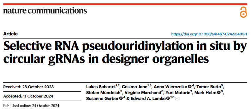 近日,德国美因茨分子生物研究所Edward A. Lemke研究团队在Nature Communications期刊上发表研究论文:Selective RNA pseudouridinylation in situ by circular gRNAs in designer organelles。研究使用RNA引导的DKC1构建了一个RNA修饰细胞器,实现mRNA选择性Ψ修饰。此外,研究利用环状gRNA显著增强了mRNA假尿嘧啶修饰,并通过Ψ修饰靶向抑制终止密码子,为从合成生物学到RNA治疗提供了新的可能性。