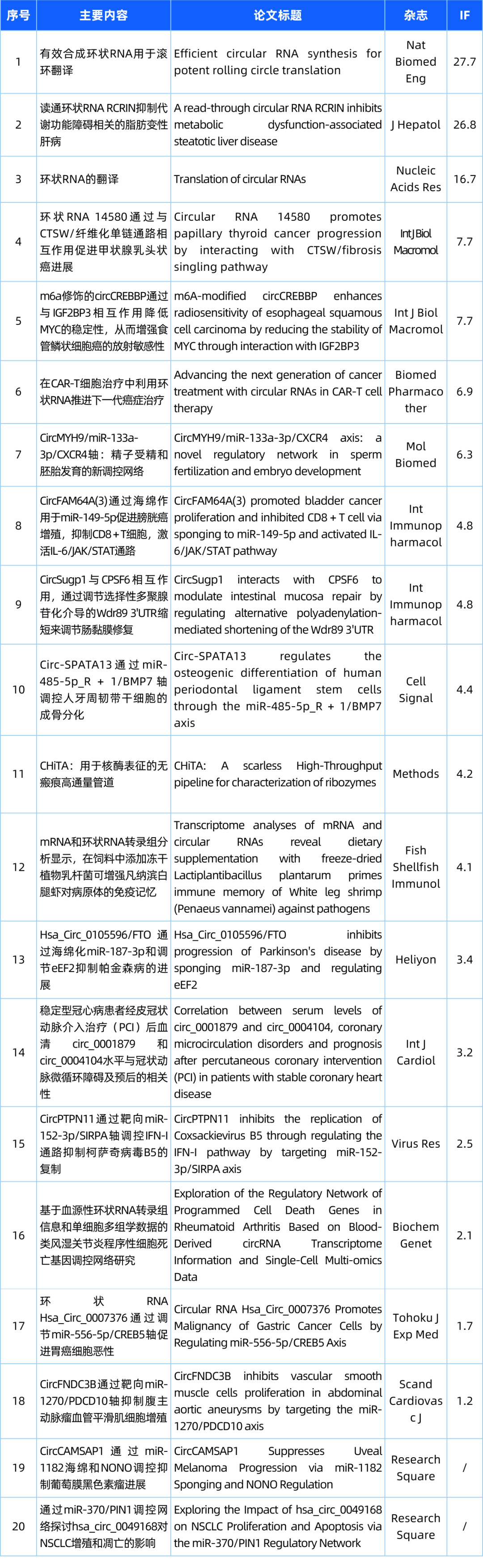 欢迎来到“circRNA研究汇总”栏目,本栏目将为您带来circRNA领域的最新研究成果。本期我们精选了20篇最新文献,涵盖了circRNA的基础研究、功能探究以及与疾病的关联。请您紧跟circRNA研究的步伐,共同洞悉科研前沿的最新动态!